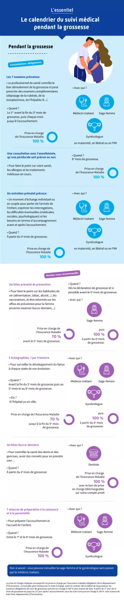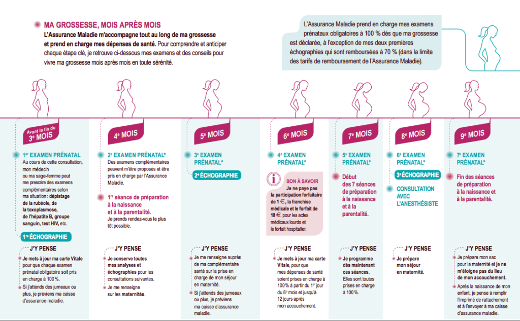 7 examens prénataux : pris en charge à 100% par la CPAM. Le premier entre le 1er  et le 3ème mois puis 1/mois : POIDS, TA, examen obstétrical