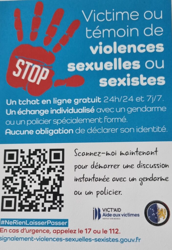 - dispositif ANGELA : certains établissements affichent une vignette indiquant qu’ils sont engagés à apporter leurs aides aux victimes de violence (harcèlement, violences physiques etc.): il suffit de dire » où est Angela? » et la personne comprend le besoin d’aide immédiat
