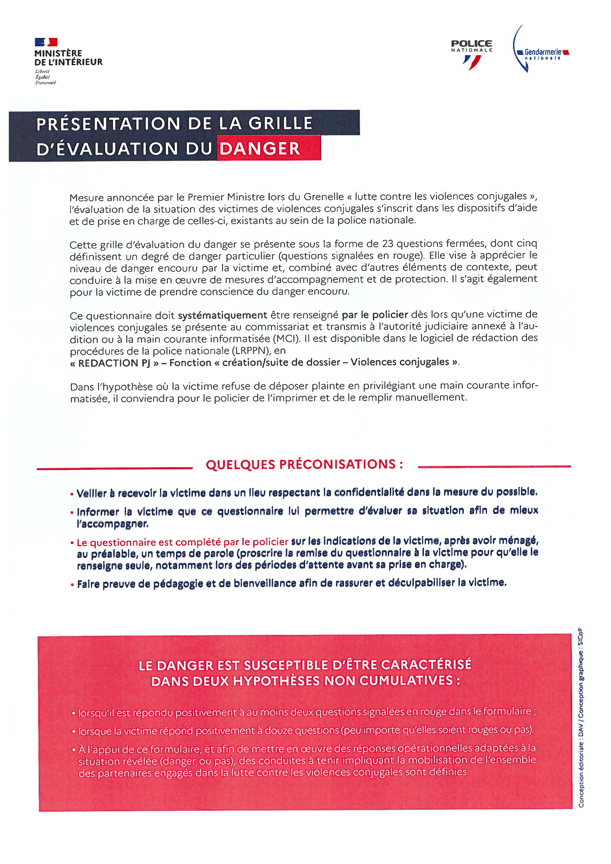 du danger : 23 questions vous sont posées visant à apprécier le danger encouru. Pour les intervenants, cela permet de juger de la nécessité de la mise en place de mesures d’accompagnement et de protection et d’apprécier l’urgence de ces mesures. Image 4 grille évaluation