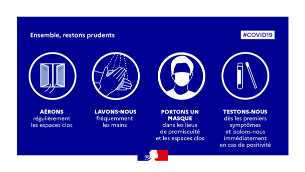 Ensemble, restons prudents. il est impératif de continuer à scrupuleusement respecter les gestes barrières. Lavage des mains, aération, port du masque : ces mesures sont, bien sûr, complémentaires de la vaccination, qui reste efficace contre les formes graves de la maladie.